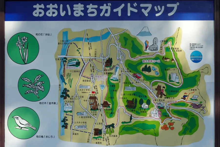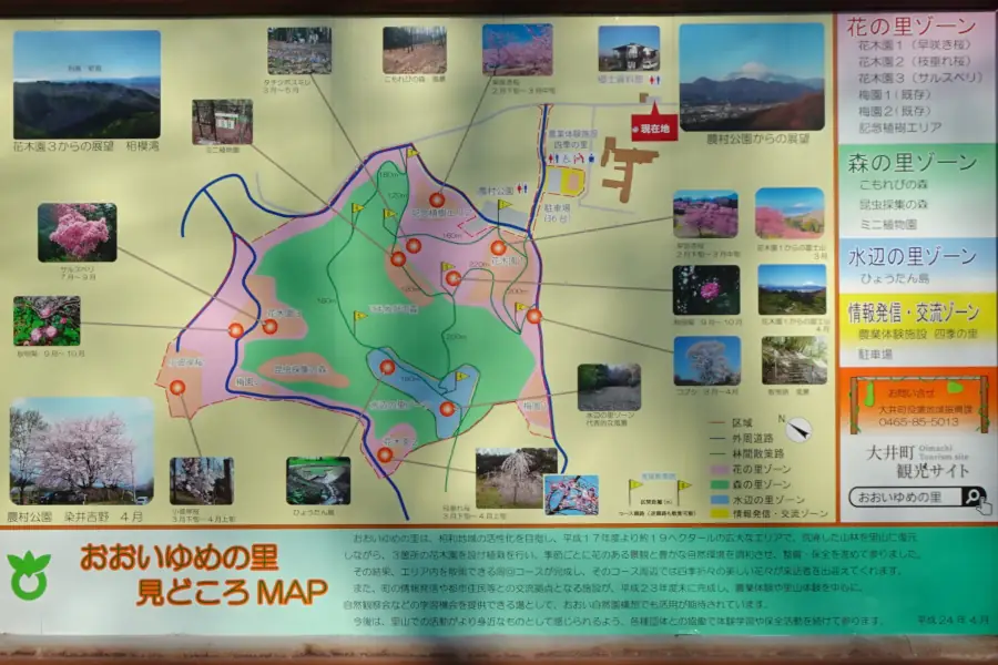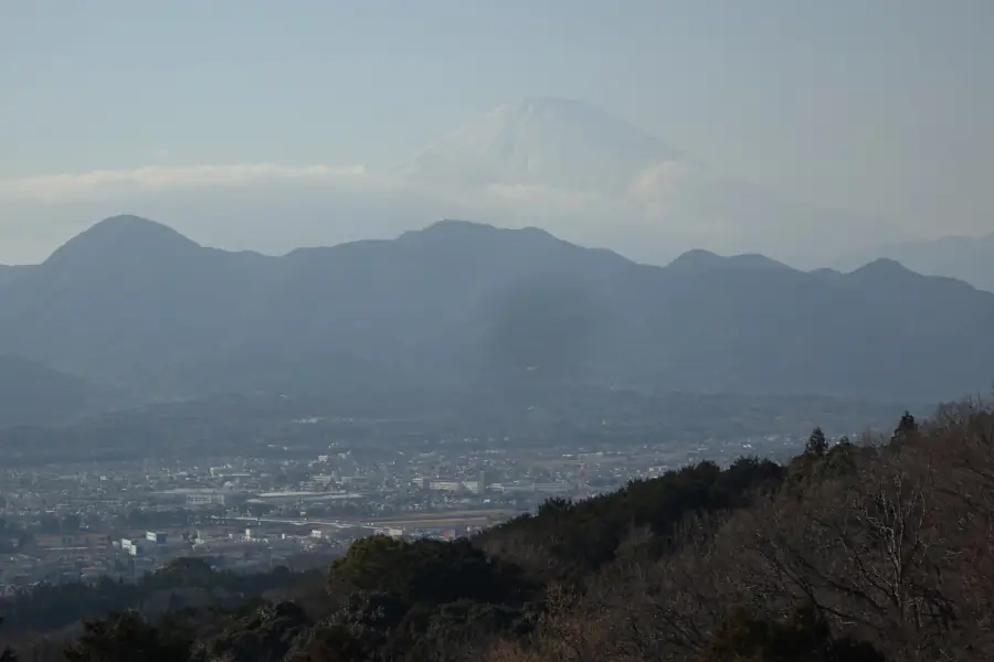 おおいゆめの里には木漏れ日のもりや花木園などが広がるところです。しかしこの時期訪れる人はあまり多くないようです。農村公園の展望台に立つと目の前に箱根の山々、その先には大きな富士山が霞んでいました。